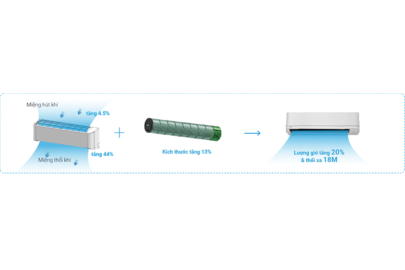 Nhờ thiết kế mới với kích thước tăng lên của miệng hút khí và miệng thổi khí cùng với thiết kế cánh quạt hình xiên mới & đường kính quạt tăng lên 13% giúp luồng gió thổi mạnh hơn, xa hơn đến 18m.